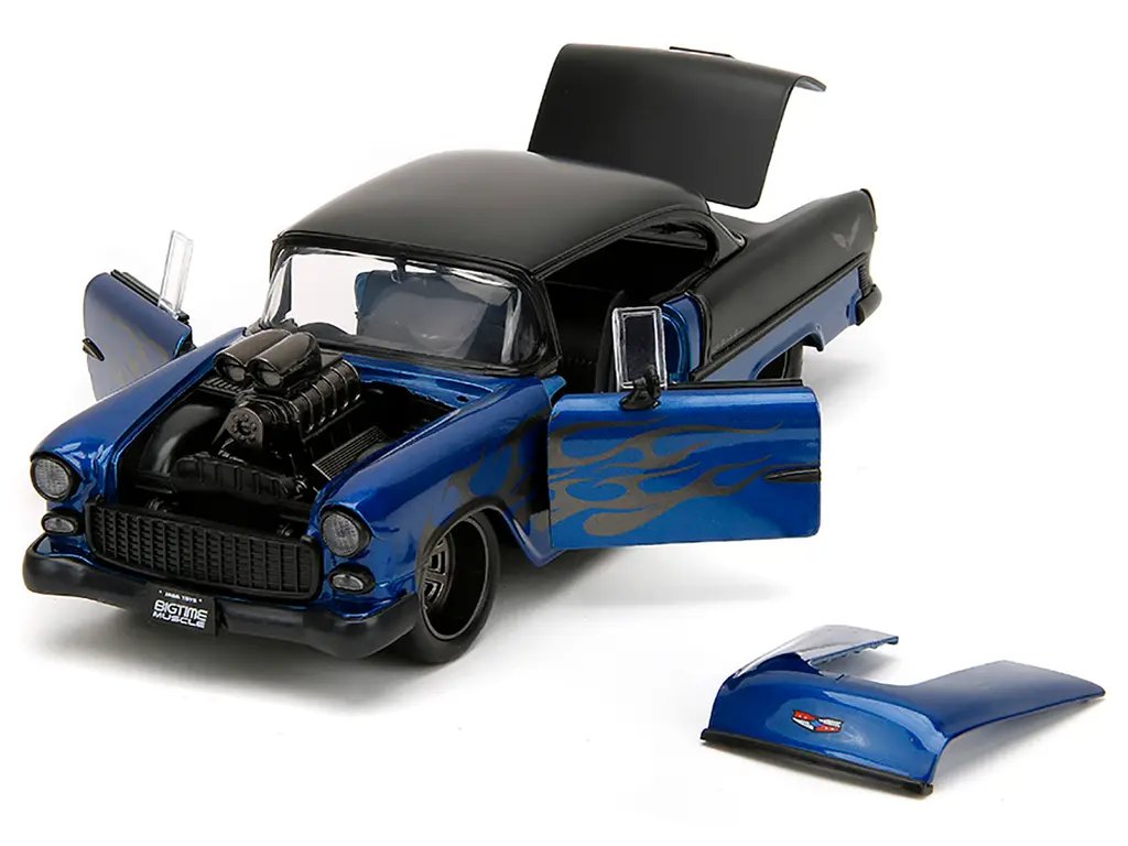 Introducing the 1955 Chevrolet Bel Air Blue Metallic and Black with Black Flames from the “Bigtime Muscle” Series by Jada, a stunning 1/24 diecast model car that captures the essence of classic American muscle with a modern twist. This meticulously crafted model is a must-have for collectors and car enthusiasts alike, offering a perfect blend of nostalgia and contemporary flair.