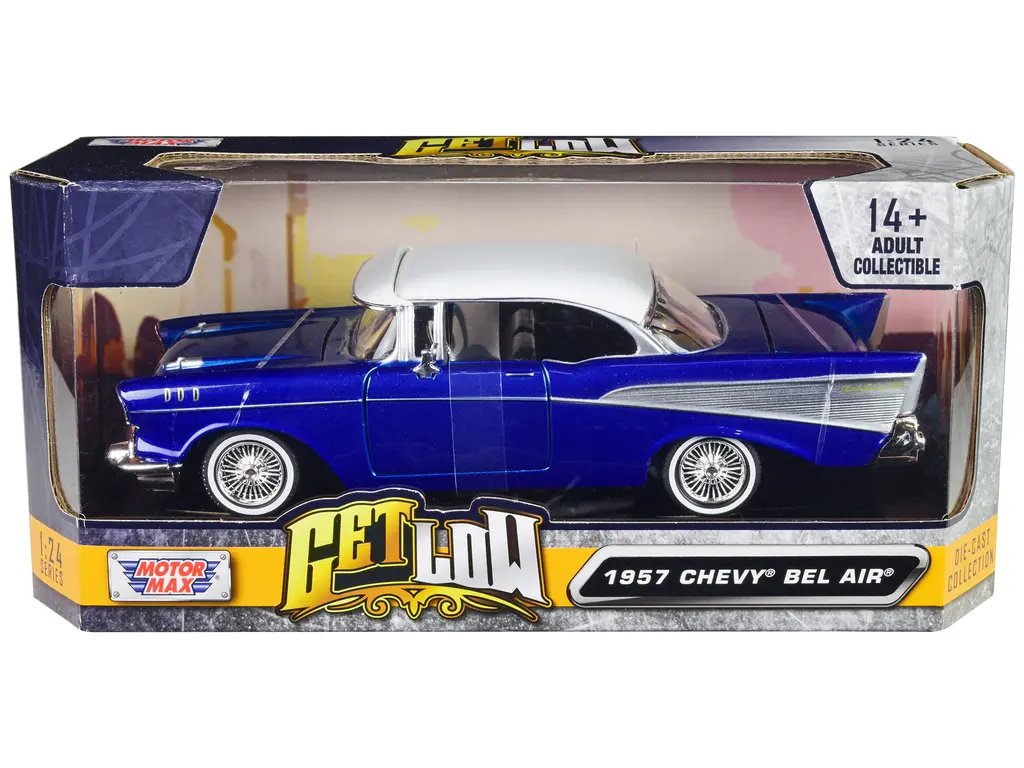 Introducing the 1957 Chevrolet Bel Air Lowrider Candy Blue with White Top “Get Low” Series 1/24 Diecast Model Car by Motormax – a stunning tribute to classic American automotive culture. This meticulously crafted diecast model captures the essence of the iconic ’57 Bel Air, renowned for its timeless design and cultural significance.