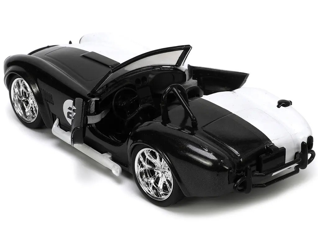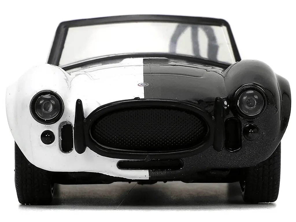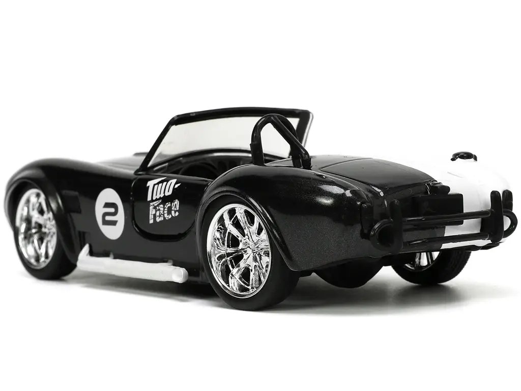 Introducing the 1965 Shelby Cobra 427 S/C #2 Black Metallic and White and Harvey Two-Face Diecast Figure from the “Batman” Hollywood Rides Series by Jada, a stunning 1/32 scale diecast model that seamlessly blends automotive history with iconic pop culture. This meticulously crafted collectible is a must-have for car enthusiasts and Batman fans alike, offering a unique fusion of classic American muscle and Gotham’s notorious villainy.