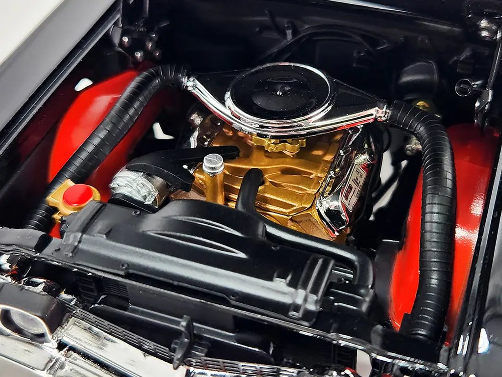 Under the hood, the model features a highly detailed replica of the legendary 400 cubic inch V8 engine, complete with authentic engine components and intricate wiring. The attention to detail extends to the undercarriage, showcasing the suspension and exhaust systems, providing a comprehensive view of the car’s engineering marvel.