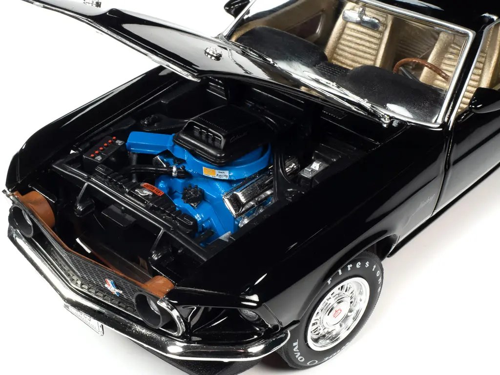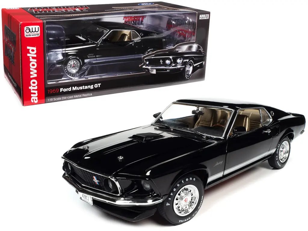 1969 Ford Mustang GT Diecast Model 1/18 – Raven Black with White Stripes & Gold Interior by Auto World