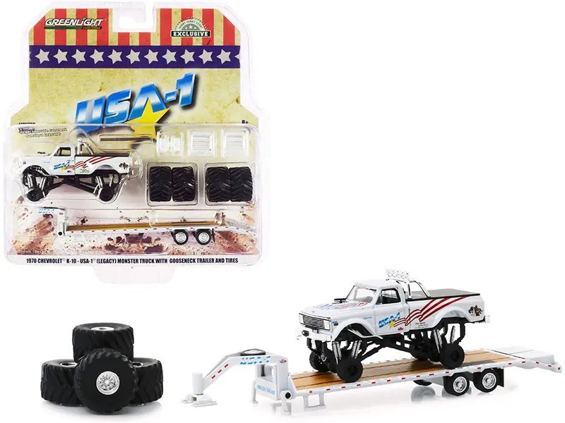Introducing the 1970 Chevrolet K-10 “USA-1” (Legacy) White Monster Truck with Bed Cover and Gooseneck Trailer, a “Hobby Exclusive” 1/64 Diecast Model Car by Greenlight. This meticulously crafted model captures the essence of a legendary era in automotive history, offering collectors and enthusiasts a unique piece of Americana.