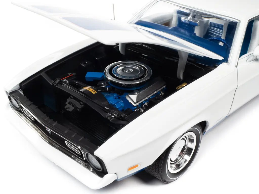 Introducing the 1972 Ford Mustang Sprint White with Blue Stripes “Class of 1972” from the “American Muscle” Series, a meticulously crafted 1/18 diecast model car by Auto World. This stunning replica captures the essence of a classic era, embodying the spirit and power of American automotive history.