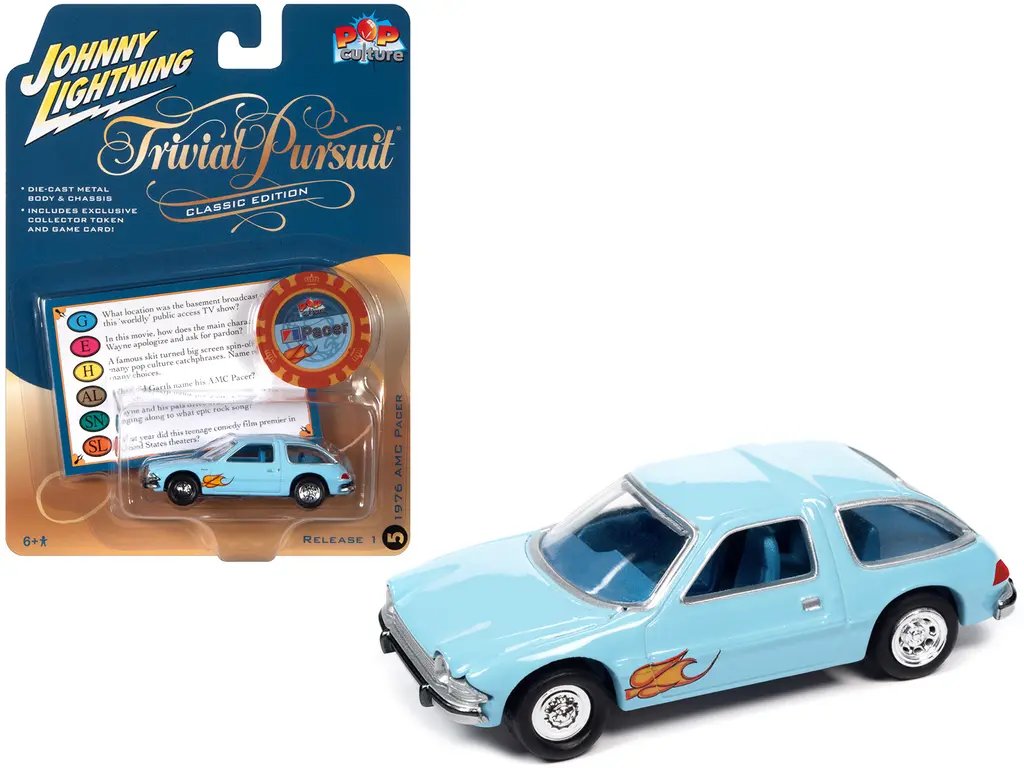 Introducing the 1976 AMC Pacer Light Blue with Flames, a captivating 1/64 diecast model car by Johnny Lightning, part of the exclusive 2023 Release 1 series. This miniature marvel is a must-have for collectors and enthusiasts alike, blending nostalgia with a touch of modern pop culture flair.