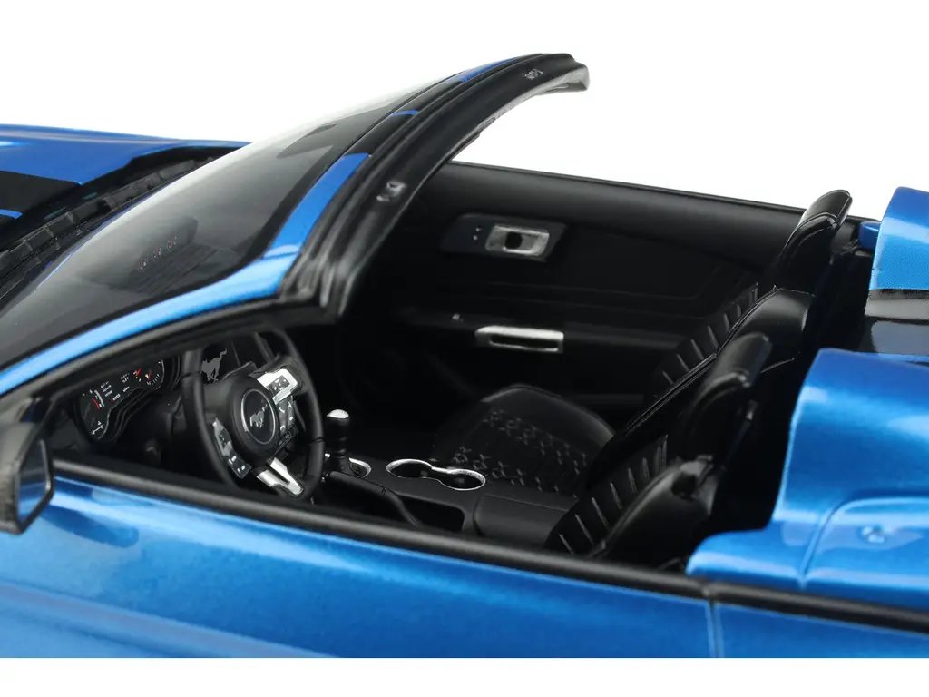 Crafted with meticulous attention to detail, this 1/18 scale model car showcases the iconic Blue Metallic finish, accentuated by bold Black Stripes that run the length of the vehicle, embodying the aggressive and sleek design synonymous with the Shelby brand. The model’s paintwork is expertly applied, reflecting light with a lustrous sheen that mirrors the real-life counterpart’s commanding presence on the road.
