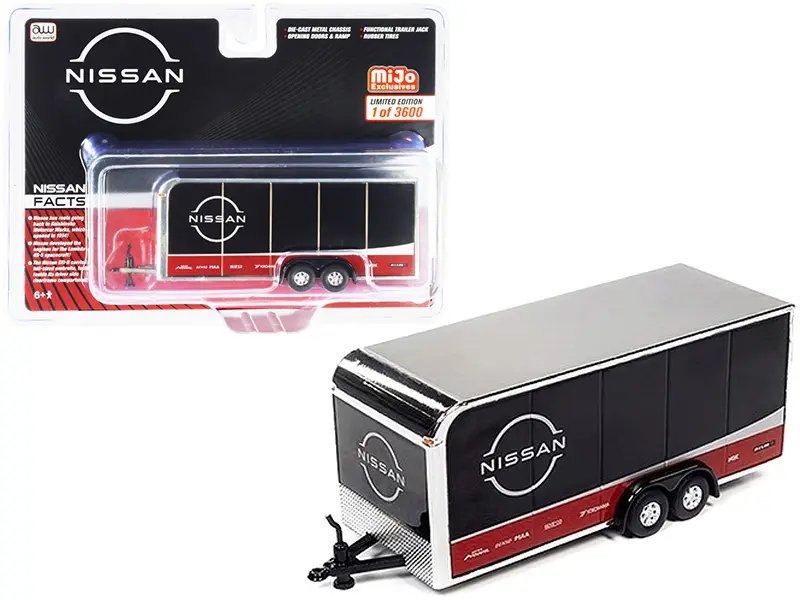 • Brand new 1/64 scale diecast model of 4-Wheel Enclosed Car Trailer “Nissan” Black die cast model by Auto World.