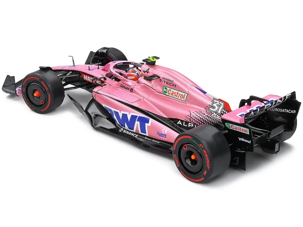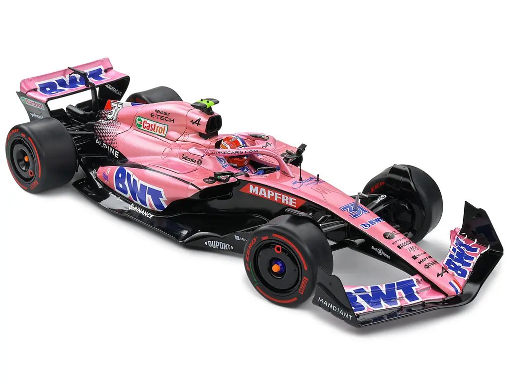 Crafted with unparalleled attention to detail, this 1/18 scale diecast model showcases the striking livery of the BWT Alpine F1 Team, featuring the iconic pink and blue color scheme that stands out on the track. The model faithfully reproduces the aerodynamic contours and intricate design elements of the A522, from the finely detailed front and rear wings to the precision-engineered suspension components.