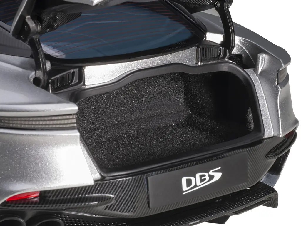 Every curve and contour of the full-sized DBS Superleggera is faithfully replicated in this 1/18 scale model, making it a must-have for collectors and car enthusiasts alike. The Lightning Silver Metallic paintwork is flawlessly applied, highlighting the sleek, aerodynamic lines that define the DBS’s aggressive yet elegant stance. The addition of the Carbon Top accentuates its sporty character, offering a stunning contrast that enhances its visual appeal.