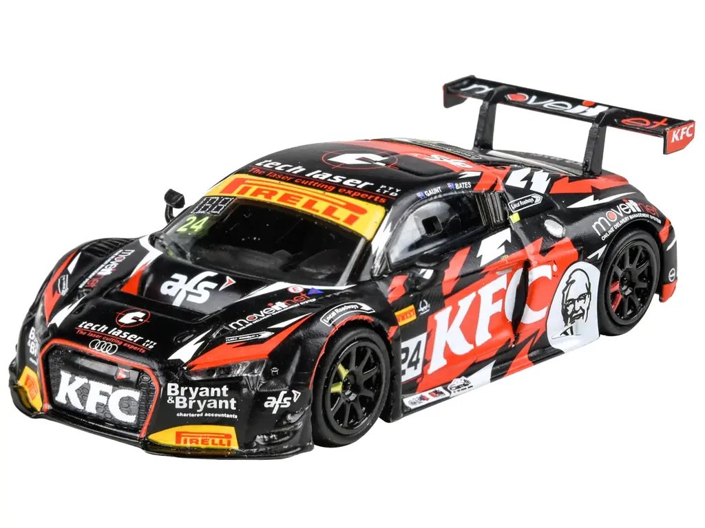 Every detail of the Audi R8 LMS has been faithfully reproduced, from its aerodynamic lines to the striking KFC Racing livery that made it a standout on the track. The model features authentic sponsor logos, precise paintwork, and intricate detailing that mirrors the real-life race car driven by Daniel Gaunt and Tony Bates to a podium finish.
