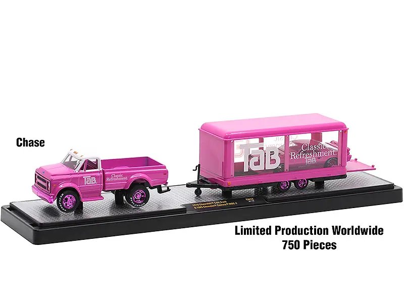 • CHASE 2: 1970 Chevrolet C60 Pickup Truck “TaB”. The Body is Pantone Pink, The Top is Bright White, The Interior is Pink, The Rims are Chrome Pink. CAR: 1985 Chevrolet Camaro IROC-Z “TaB”. The Body is Pantone Pink, The Interior is Pink, The Rims are Chrome Pink. TRAILER: Enclosed Trailer. The Body is Pantone Pink, The Rims are Chrome Pink. Limited Edition to 750 pieces Worldwide.