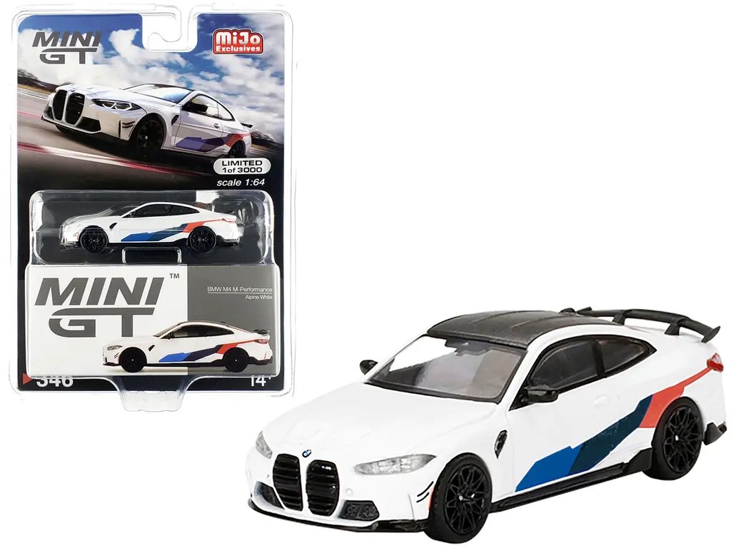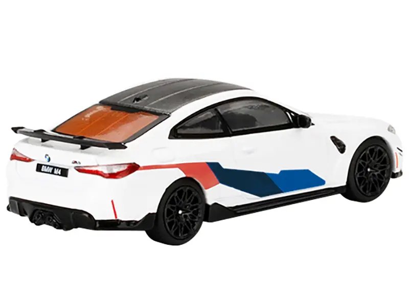 Introducing the BMW M4 M-Performance (G82) Alpine White with Carbon Top and Graphics Limited Edition 1/64 Diecast Model Car by True Scale Miniatures—a masterpiece of precision and passion, crafted for the discerning collector. Limited to just 3,000 pieces worldwide, this exclusive model captures the essence of BMW’s iconic M4, renowned for its exhilarating performance and cutting-edge design.