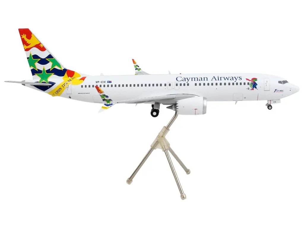 The model features the iconic white fuselage adorned with the vibrant and culturally rich tail graphics of Cayman Airways, showcasing the airline’s heritage and pride. The intricate design on the tail, combined with the sleek lines of the Boeing 737 MAX 8, makes this model a visually striking addition to any collection.