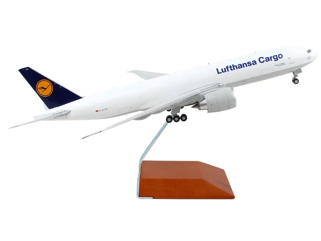 The model replicates the iconic Lufthansa Cargo livery, featuring a pristine white fuselage complemented by a striking blue tail adorned with the Lufthansa logo. Every aspect of the aircraft has been faithfully reproduced, from the intricate landing gear to the detailed engine nacelles, ensuring a true-to-life representation of the real Boeing 777-200F.