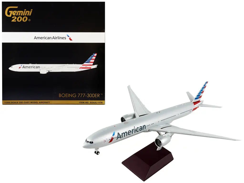 This 1/200 scale diecast model is a testament to GeminiJets’ commitment to quality and authenticity. Every aspect of the Boeing 777-300ER is replicated with precision, from the sleek fuselage adorned with American Airlines’ iconic silver livery to the intricately detailed engines and landing gear. The model features accurate markings and logos, ensuring a faithful representation of the aircraft as it soars through the skies.