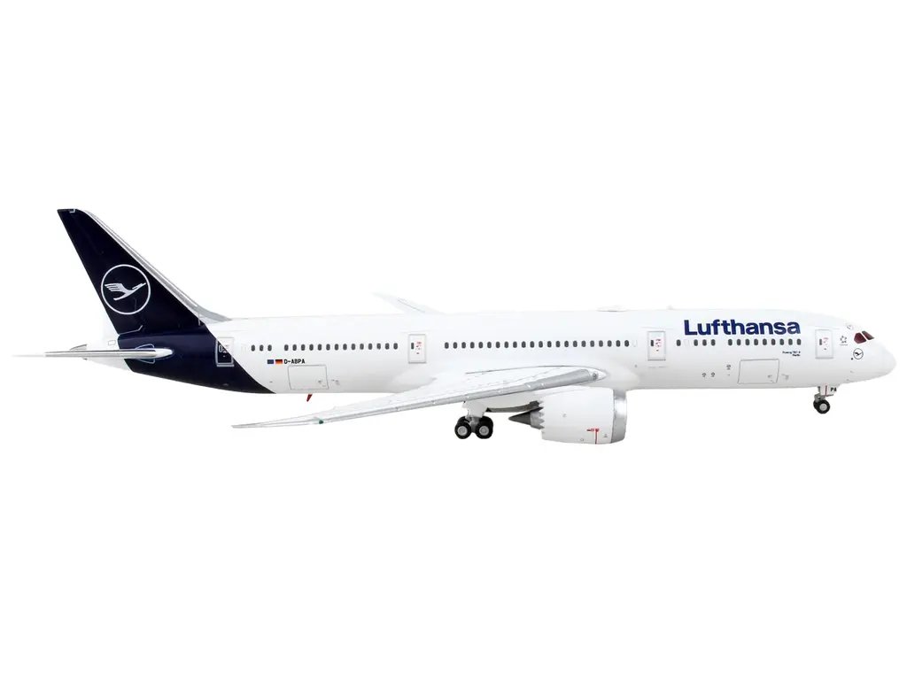 Introducing the Boeing 787-9 Commercial Aircraft “Lufthansa – D-ABPA” White with Dark Blue Tail 1/400 Diecast Model Airplane by GeminiJets, a meticulously crafted replica that captures the elegance and innovation of one of the world’s most advanced passenger aircraft. This exquisite model is a must-have for aviation enthusiasts and collectors alike, offering a tangible connection to the skies and the iconic Lufthansa fleet.