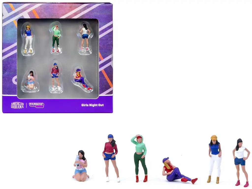 Introducing the “Girls Night Out” 6 Piece Diecast Figure Set by Tarmac Works, a captivating addition to your 1/64 scale model collection. This meticulously crafted set brings a vibrant and dynamic scene to life, perfect for enhancing your diorama displays or adding a touch of personality to your model car setups.