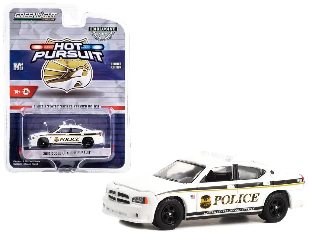 Introducing the 2010 Dodge Charger Pursuit White “United States Secret Service Police” Washington DC “Hot Pursuit” Special Edition 1/64 Diecast Model Car by Greenlight—a must-have collectible for diecast enthusiasts and law enforcement aficionados alike. This meticulously crafted model captures the essence of the iconic vehicles used by the elite United States Secret Service Police, renowned for their role in protecting the nation’s capital and its leaders.