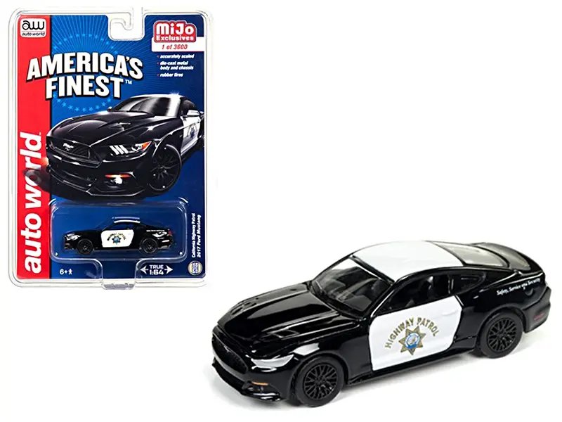 Introducing the 2017 Ford Mustang GT “America’s Finest” CHP California Highway Patrol Limited Edition 1/64 Diecast Model Car by Auto World—a must-have collectible for car enthusiasts and diecast aficionados alike. This meticulously crafted model pays homage to the iconic California Highway Patrol vehicles, capturing the essence of American automotive excellence and law enforcement prestige.