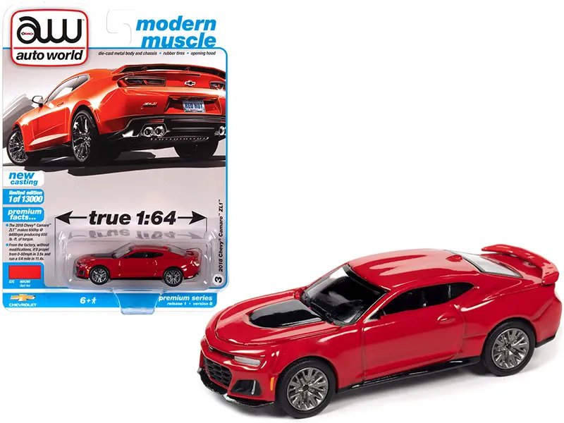 Introducing the 2018 Chevrolet Camaro ZL1 Red Hot “Modern Muscle” Limited Edition 1/64 Diecast Model Car by Auto World—a must-have collectible for car enthusiasts and diecast aficionados alike. This meticulously crafted model captures the essence of the iconic Camaro ZL1, renowned for its blend of raw power and sleek design, in a stunning 1/64 scale.