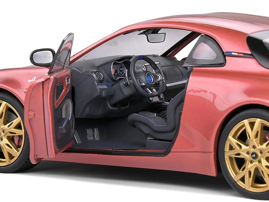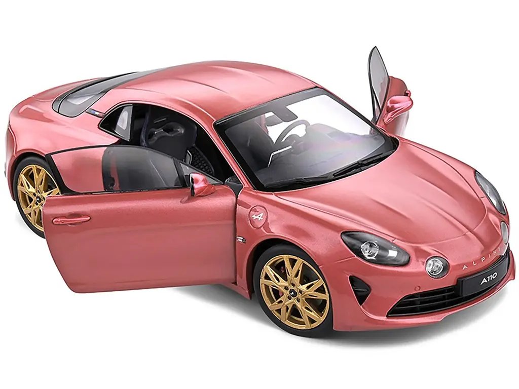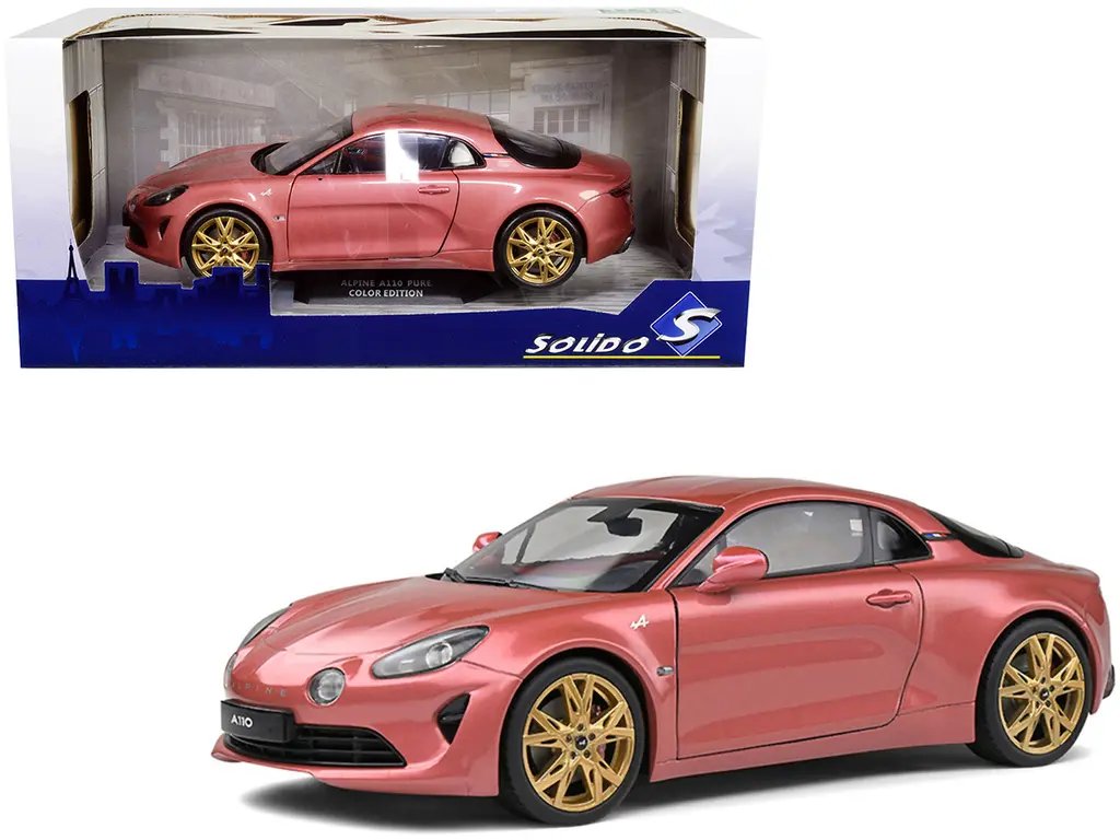 The 2021 Alpine A110 Rose Bruyere Pink Metallic with Gold Wheels 1/18 Diecast Model Car by Solido is a stunning collectible that perfectly captures the essence of French automotive elegance and performance. This meticulously crafted diecast model is a tribute to the iconic Alpine A110, a car celebrated for its lightweight design, agile handling, and timeless style.
