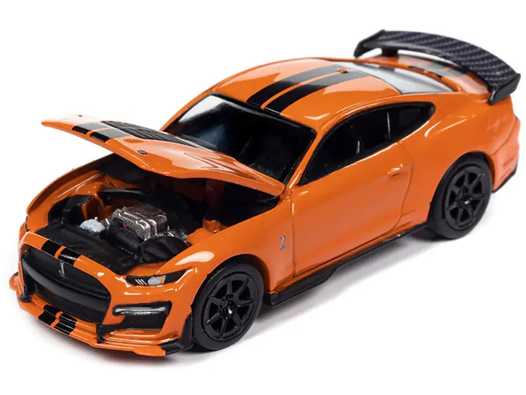 The 2021 Ford Mustang Shelby GT500 Carbon Fiber Track Pack Twister Orange with Black Stripes “Modern Muscle” Limited Edition 1/64 Diecast Model Car by Auto World is more than just a model; it’s a celebration of speed, power, and precision. Own a piece of the legend and experience the allure of modern muscle in miniature form.