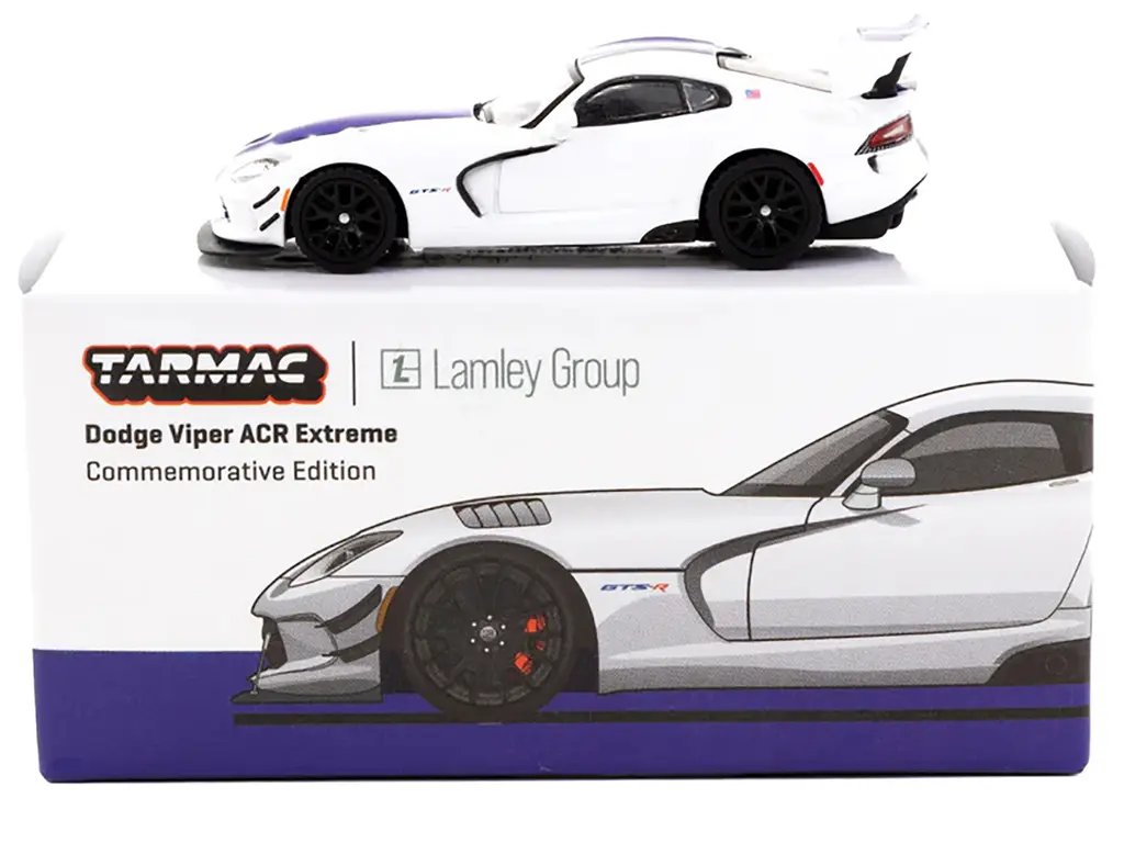 Introducing the Dodge Viper ACR Extreme Commemorative Edition White with Blue Stripes “Lamley Group Special Edition” from the “Global64” Series by Tarmac Works—a must-have for diecast collectors and automotive enthusiasts alike. This 1/64 scale model car is a stunning tribute to the legendary Dodge Viper ACR, renowned for its raw power and track-dominating performance.