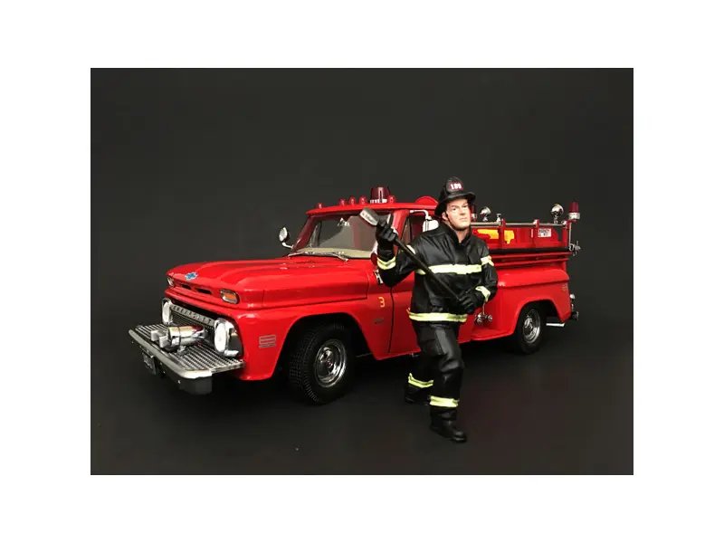 Standing at approximately 4 inches tall, this figurine is expertly designed to fit seamlessly into any 1:18 scale diorama or model scene. The attention to detail is evident in the firefighter’s realistic pose, as he stands ready with his axe, embodying the courage and readiness of real-life heroes. The figure is hand-painted, showcasing vibrant colors and intricate details that bring the character to life, from the reflective stripes on his uniform to the determined expression on his face.
