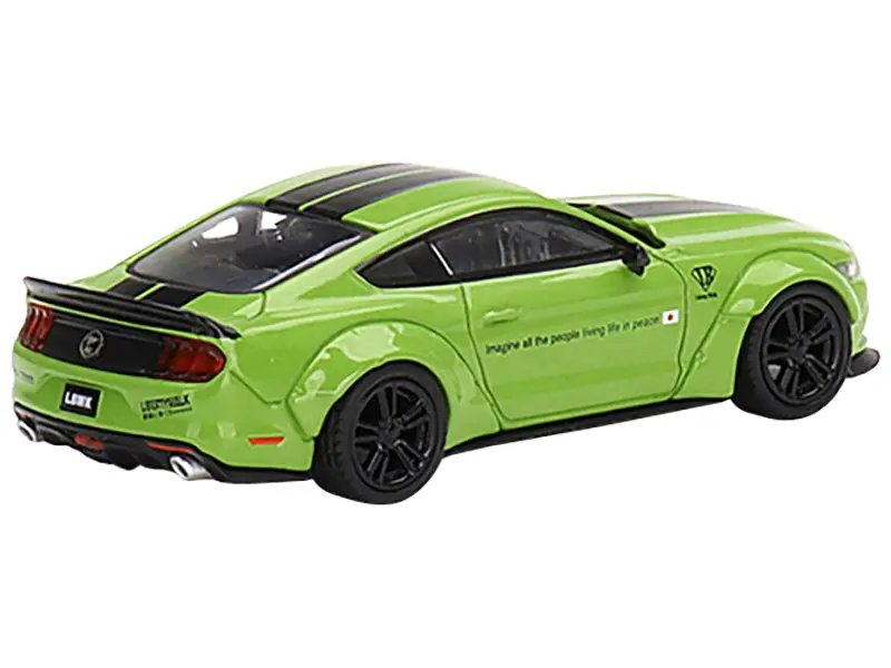 Introducing the Ford Mustang LB-WORKS Grabber Lime Green with Black Stripes “Imagine All The People Living Life In Peace” Limited Edition 1/64 Diecast Model Car by True Scale Miniatures—a masterpiece of automotive artistry and a tribute to the spirit of harmony. This exclusive model, limited to just 3000 pieces worldwide, captures the essence of the iconic Ford Mustang with a unique twist that will captivate collectors and enthusiasts alike.