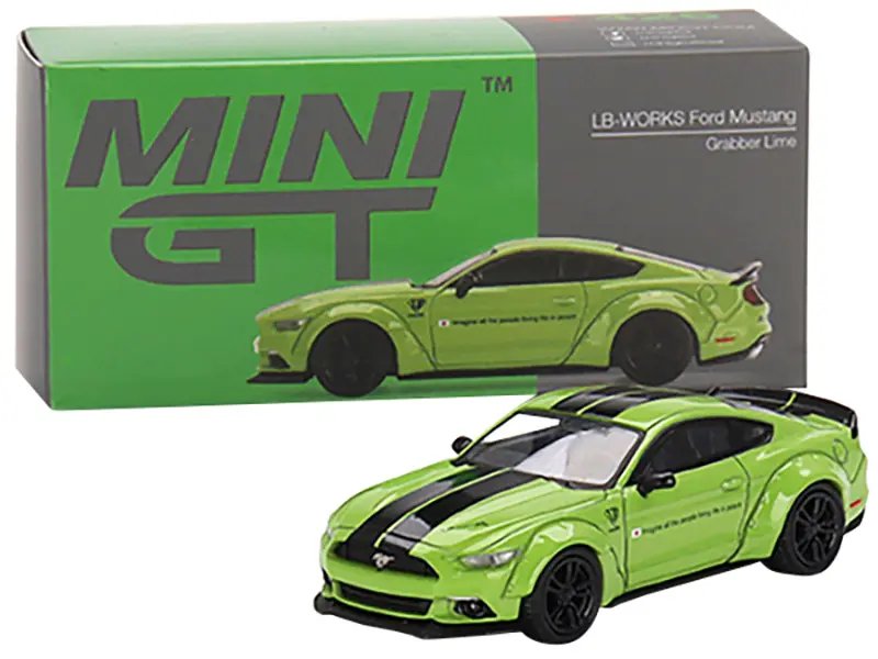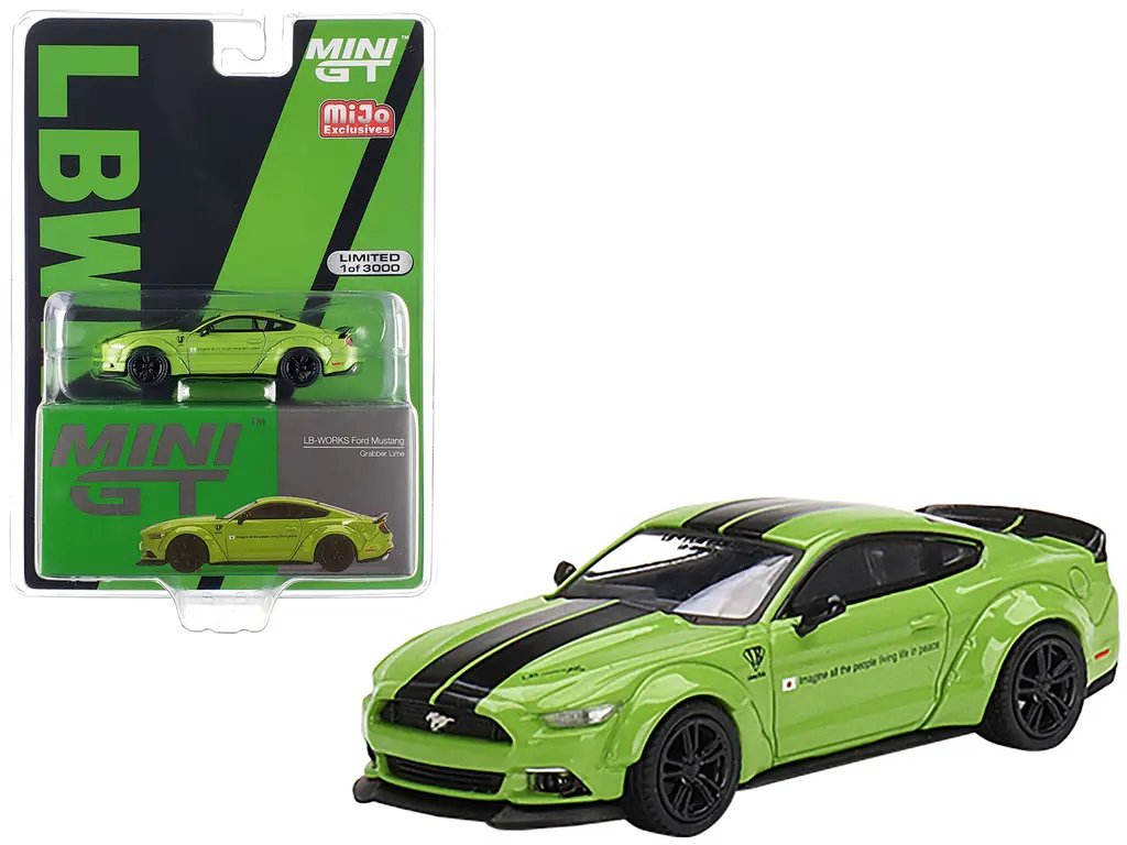 Secure your piece of automotive history with the Ford Mustang LB-WORKS Grabber Lime Green with Black Stripes “Imagine All The People Living Life In Peace” Limited Edition 1/64 Diecast Model Car by True Scale Miniatures. With only 3000 pieces available worldwide, this is a rare opportunity to own a model that combines exquisite craftsmanship, iconic design, and a powerful message.