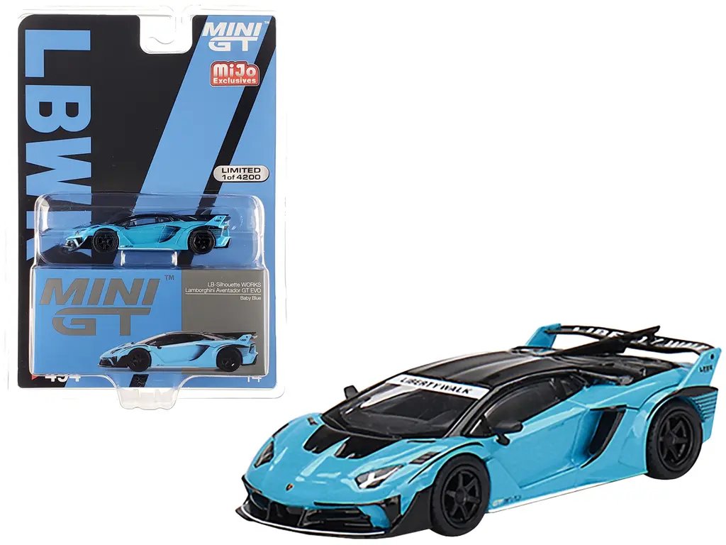 Introducing the Lamborghini Aventador GT EVO “LB-Silhouette Works” Baby Blue with Black Top Limited Edition 1/64 Diecast Model Car by True Scale Miniatures—a masterpiece of precision and artistry, limited to just 4200 pieces worldwide. This exquisite model captures the essence of Lamborghini’s iconic design and performance, meticulously crafted to delight collectors and automotive enthusiasts alike.