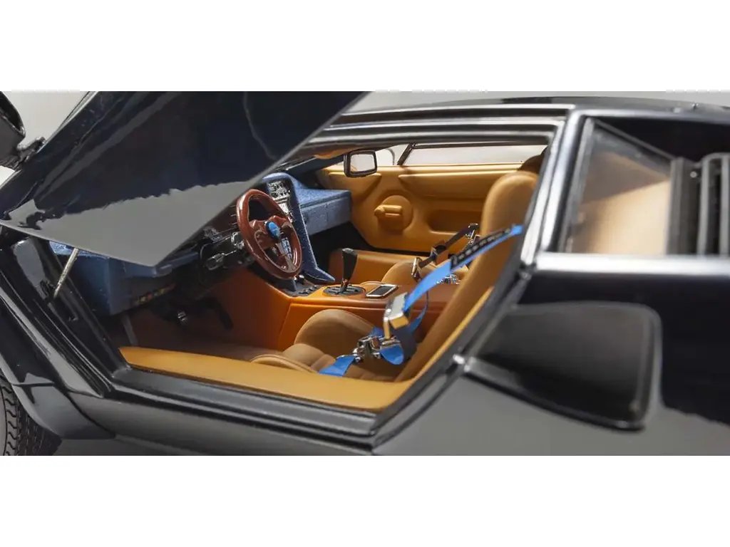 The model is finished in an exquisite dark blue, mirroring the unique color scheme of the original Walter Wolf special edition. The paintwork is flawlessly applied, highlighting the car’s aggressive lines and aerodynamic silhouette. Every curve and contour of the Countach is faithfully reproduced, from the signature scissor doors to the distinctive rear wing, making it a striking centerpiece for any collection.