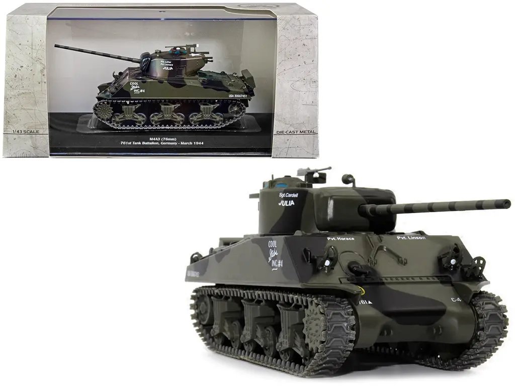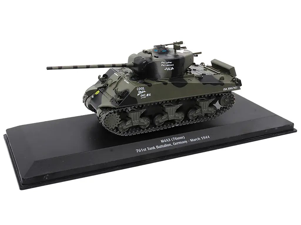 Introducing the meticulously crafted M4A3 (76mm) Tank “Julia” from the renowned AFVs of WWII collection, a 1/43 scale diecast model that pays homage to the legendary U.S.A. 761st Tank Battalion. This exquisite replica captures the essence of the formidable armored vehicle that played a pivotal role in the European theater during March 1944.