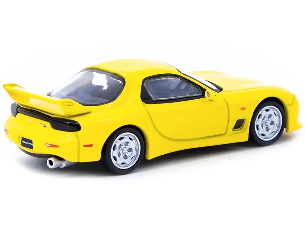 Introducing the Mazda RX-7 (FD3S) Mazdaspeed A-Spec RHD in Competition Yellow Mica from the “Global64” Series by Tarmac Works, a 1/64 scale diecast model car that epitomizes precision, performance, and passion. This meticulously crafted miniature captures the essence of the iconic RX-7, renowned for its rotary engine and sleek design, making it a must-have for collectors and automotive enthusiasts alike.