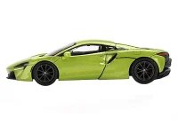 The interior of the model is equally impressive, with a finely detailed cockpit that includes the iconic McLaren steering wheel, dashboard, and seating, offering a glimpse into the luxurious yet performance-focused environment of the Artura. The model rests on perfectly scaled wheels with authentic tire treads, enhancing its realism and appeal.