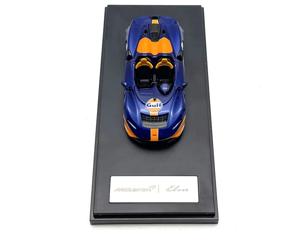 The model features a striking dark blue metallic finish, complemented by vibrant orange accents that pay homage to the legendary Gulf Oil racing livery. Every detail, from the aerodynamic curves to the sleek lines, has been faithfully reproduced to mirror the original supercar. The open-top design showcases the intricate interior, complete with detailed seats, dashboard, and steering wheel, offering a glimpse into the luxurious and high-tech cockpit of the McLaren Elva.