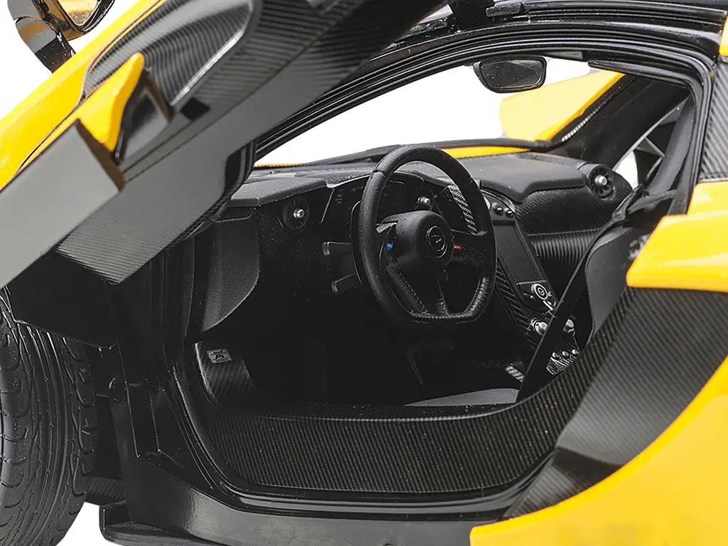 The model features an intricately detailed interior, complete with carbon fiber accents, racing-inspired bucket seats, and a fully replicated dashboard. The steering wheel, center console, and instrument cluster are rendered with astonishing accuracy, offering a glimpse into the cockpit of this technological marvel. The doors are functional, allowing you to admire the interior from every angle, while the engine bay reveals the heart of the P1—a hybrid powertrain that revolutionized the hypercar segment.