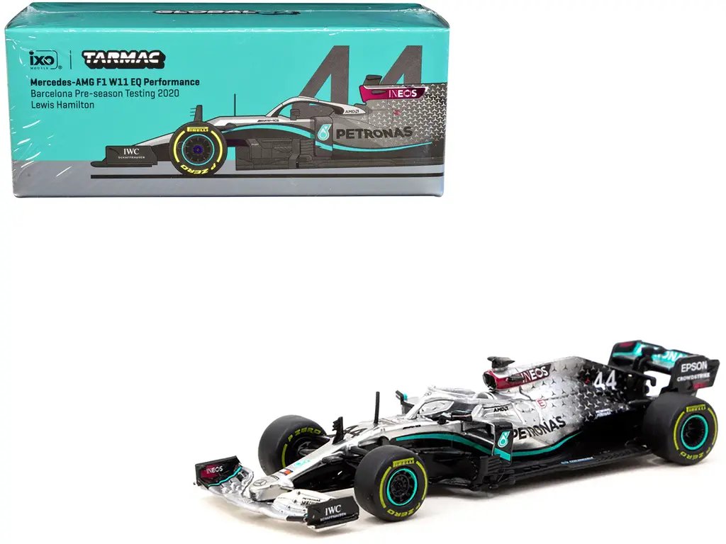 Introducing the Mercedes-AMG F1 W11 EQ Performance #44 Lewis Hamilton “Barcelona Pre-Season Testing” (2020) from the esteemed “Global64” Series by Tarmac Works—a meticulously crafted 1/64 diecast model that captures the essence of Formula 1 excellence. This exquisite model car is a tribute to the engineering marvel and racing prowess of the W11, driven by the legendary Lewis Hamilton during the 2020 pre-season testing in Barcelona.