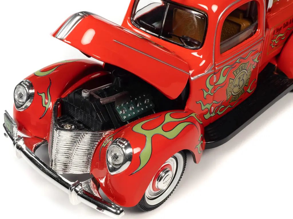The model is a stunning 1/18 scale replica of a classic fire engine truck, painted in a vibrant fire engine red that captures the essence of vintage emergency vehicles. Adorned with intricate Rat Fink graphics, this model is a visual feast, showcasing the rebellious spirit and artistic flair that Rat Fink is known for. The attention to detail is impeccable, from the authentic fire engine features like ladders and hoses to the gleaming chrome accents that add a touch of realism and elegance.