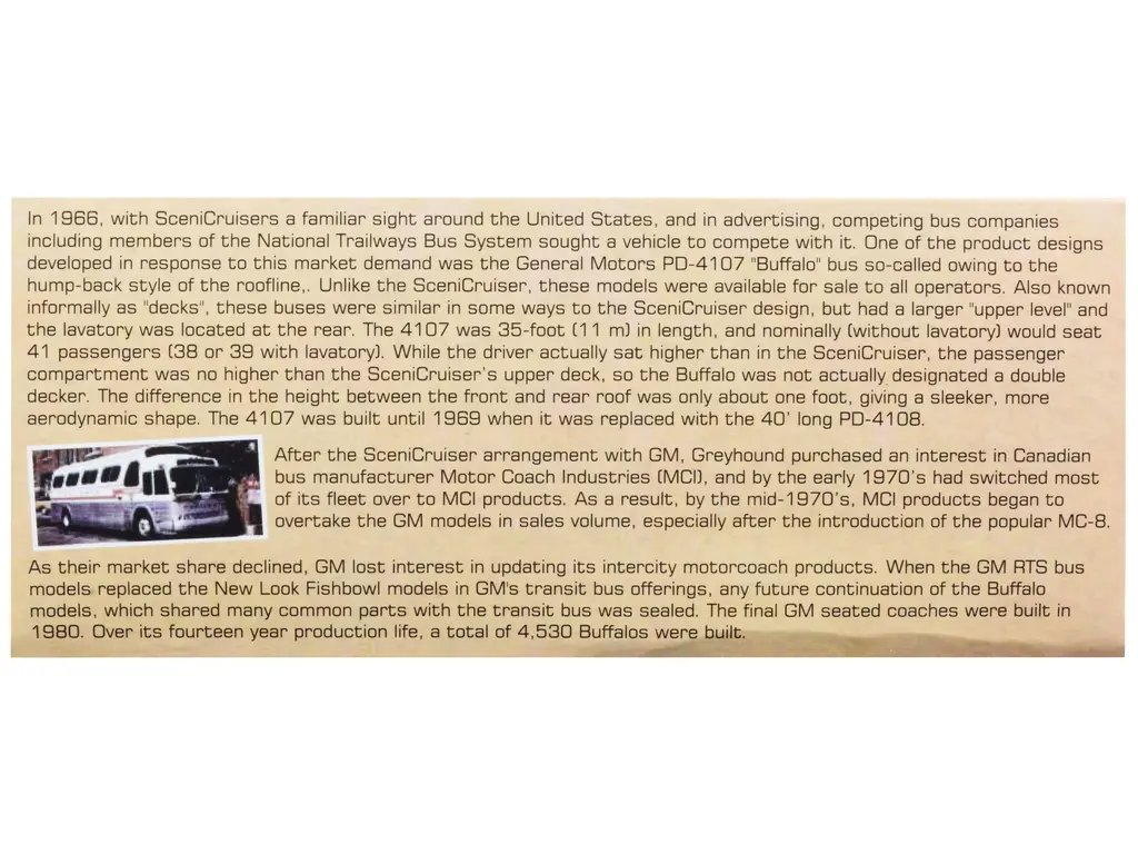 Measuring 35 feet in length, the PD4107 features a robust aluminum body and stainless steel accents, ensuring both lightweight construction and long-lasting durability. Its signature “Buffalo” moniker comes from its powerful Detroit Diesel 8V71 engine, renowned for its reliability and performance. Paired with a 4-speed manual transmission, this coach delivers a smooth and commanding ride, making it ideal for long-distance travel or stationary use.